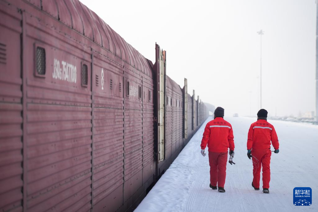 1月31日,在新疆乌鲁木齐中铁特货乌鲁木齐分公司三坪物流基地,工作人员在列车站台巡视。