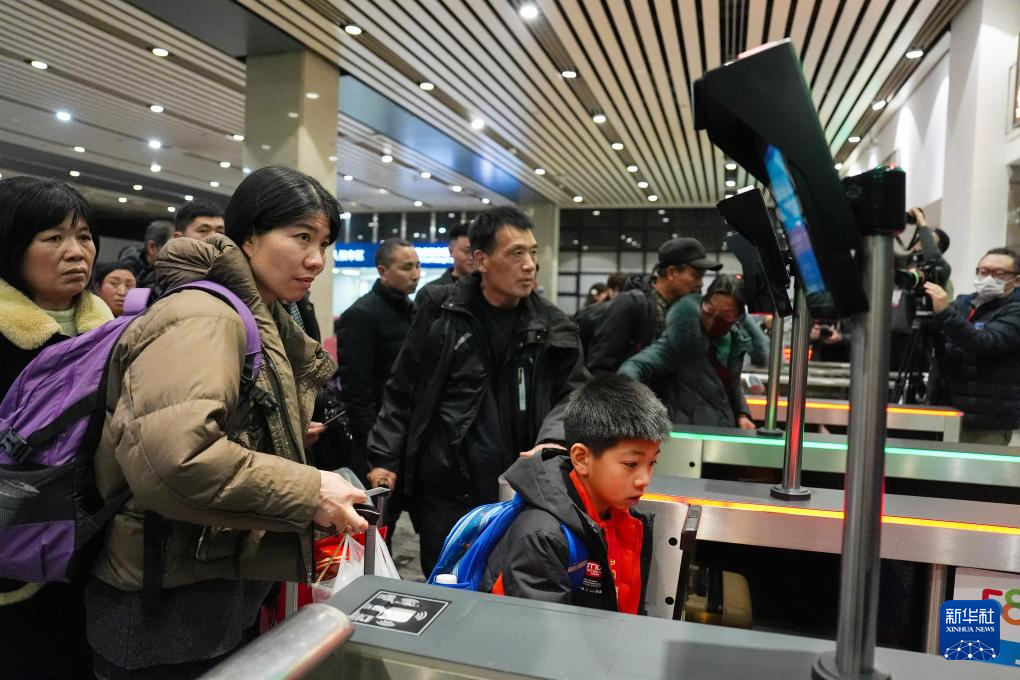 2月1日深夜,在北京西站候车室,乘坐K4069次列车的旅客排队进站乘车。