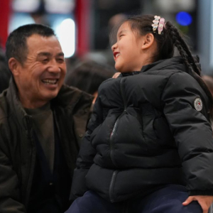 2月1日深夜,在北京西站候车室,五岁的代辰曦(右)和爷爷玩耍。她将跟随妈妈、爷爷和奶奶一起乘坐K4069次列车返回老家河南固始过年。