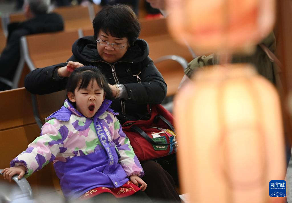 2月2日,在西安站候车大厅,一位旅客在候车期间为孩子梳头。