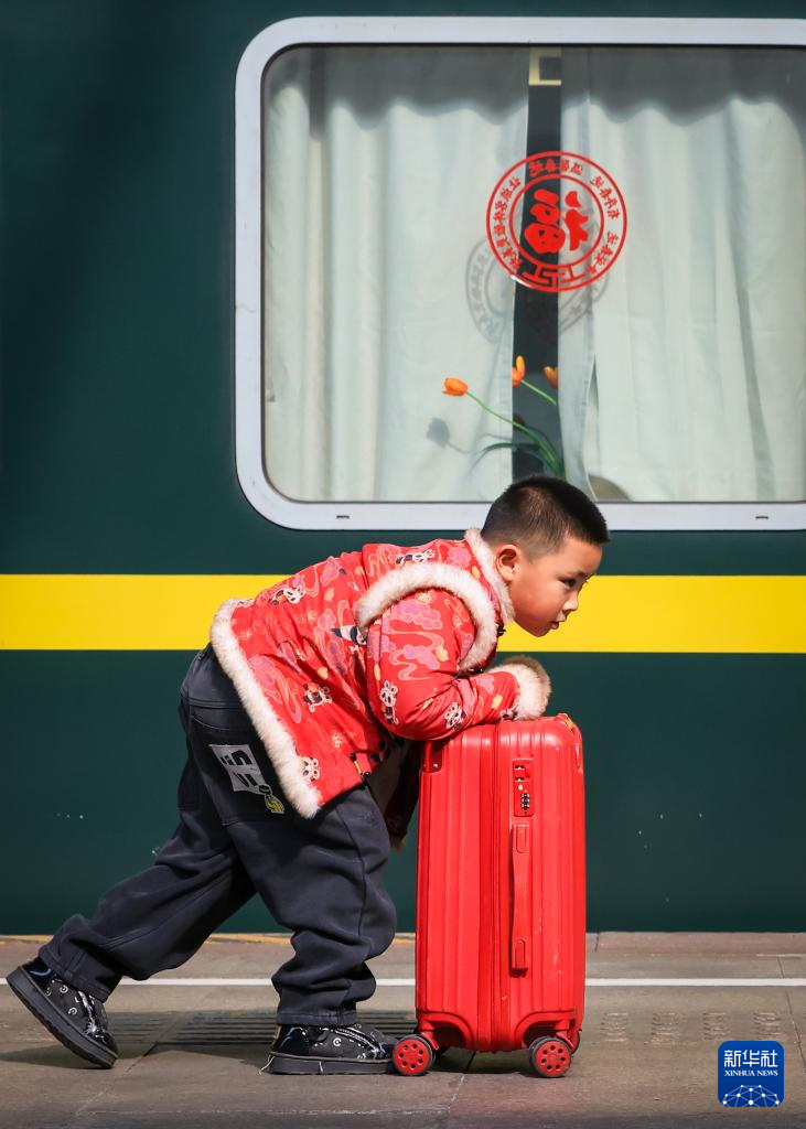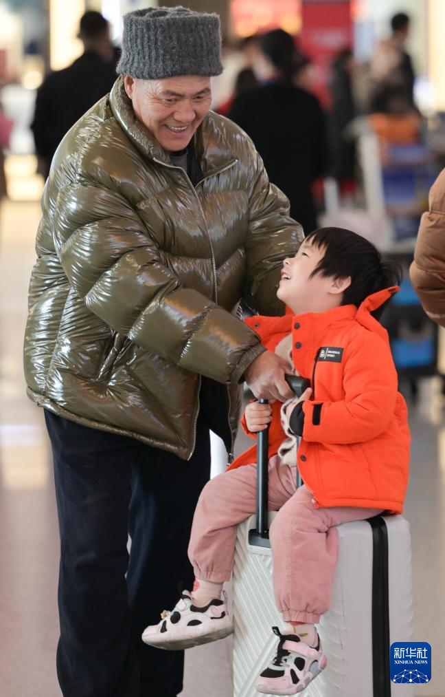 2月2日,在北京西站,小朋友跟随家长进站乘车。