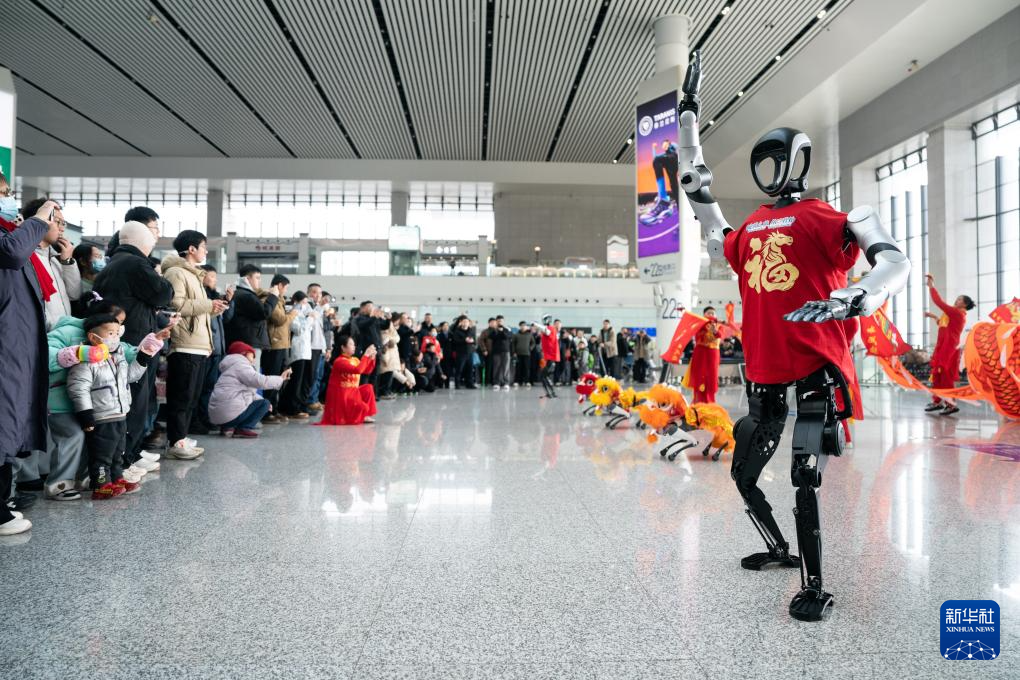 2月2日,机器人在江苏昆山南站候车大厅为旅客表演舞蹈。