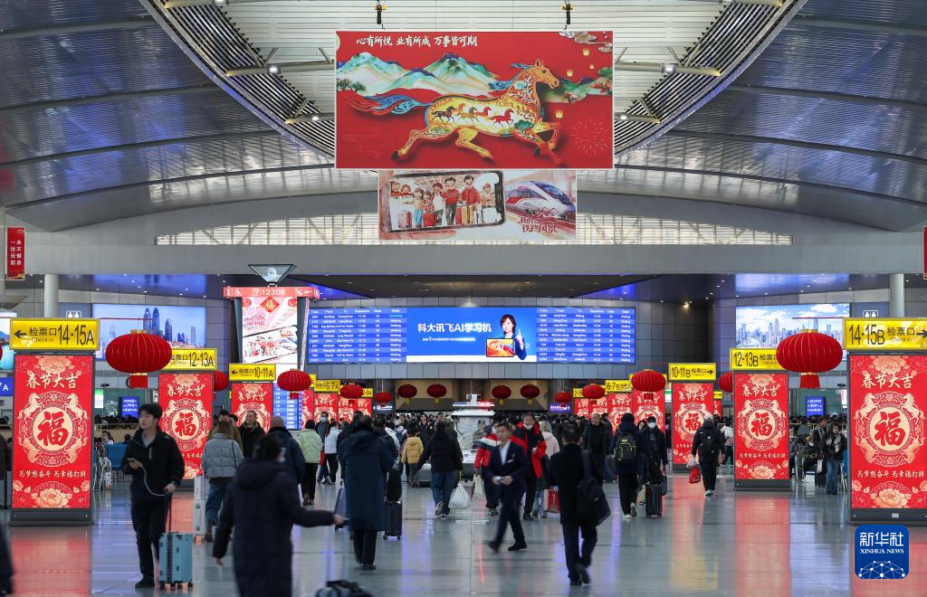 2月2日,旅客在西安站候车大厅的主题文化墙前留影。