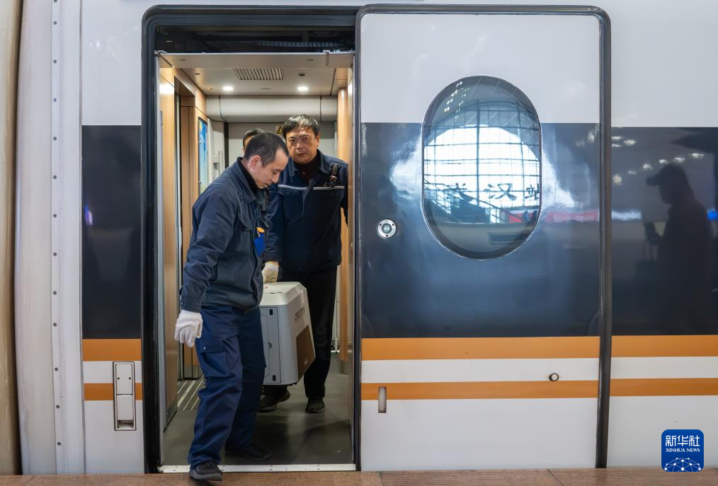 2月3日,在湖北武汉火车站,工作人员将“高铁宠物运输智能箱”搬下列车。