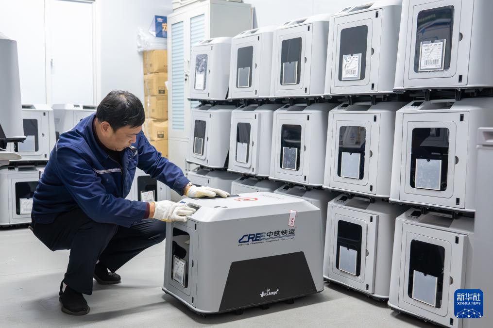 2月3日,在湖北武汉火车站,工作人员将“高铁宠物运输智能箱”搬到置换间等待宠物主人。