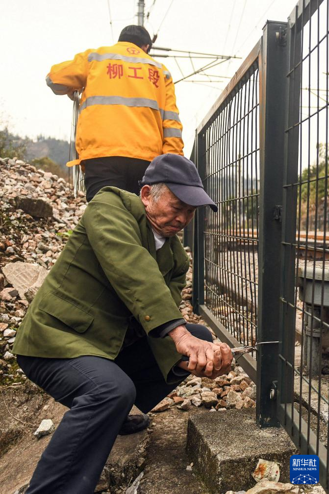 2026年2月4日,王庆财在协助铁路工人修补受损的铁路围栏。