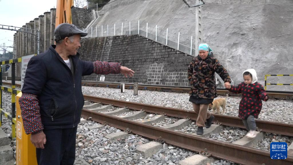 春运期间,在湘桂边界的广西三江侗族自治县八江镇八斗村,过村的焦柳铁路运输愈发繁忙。今年70岁的王庆财像往年一样在铁道口当“哨兵”,保障运输安全。
