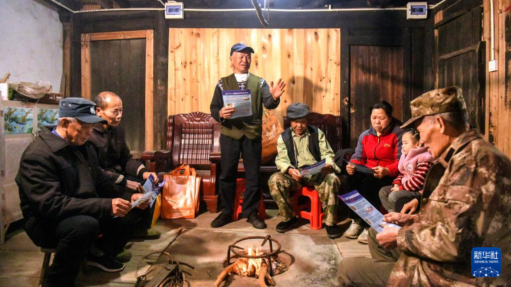 2026年2月3日,王庆财(中)给村民宣讲春运期间铁路安全注意事项。