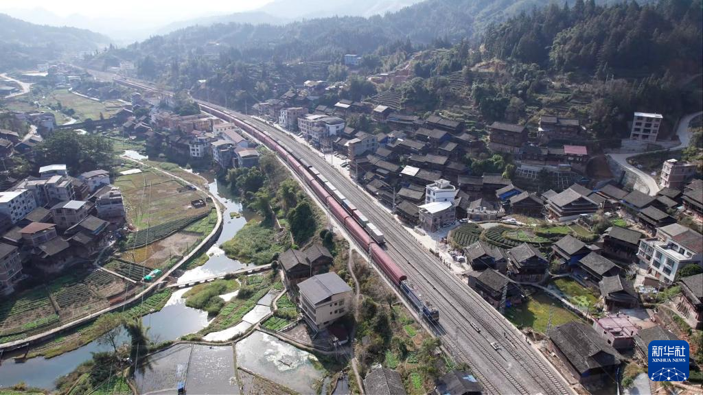 火车穿过广西三江侗族自治县八斗镇八斗村(无人机照片,2025年12月16日摄)。
