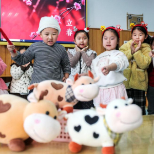 2月4日,在河南省焦作市博爱县县直幼儿园,小朋友做“打春牛”游戏。