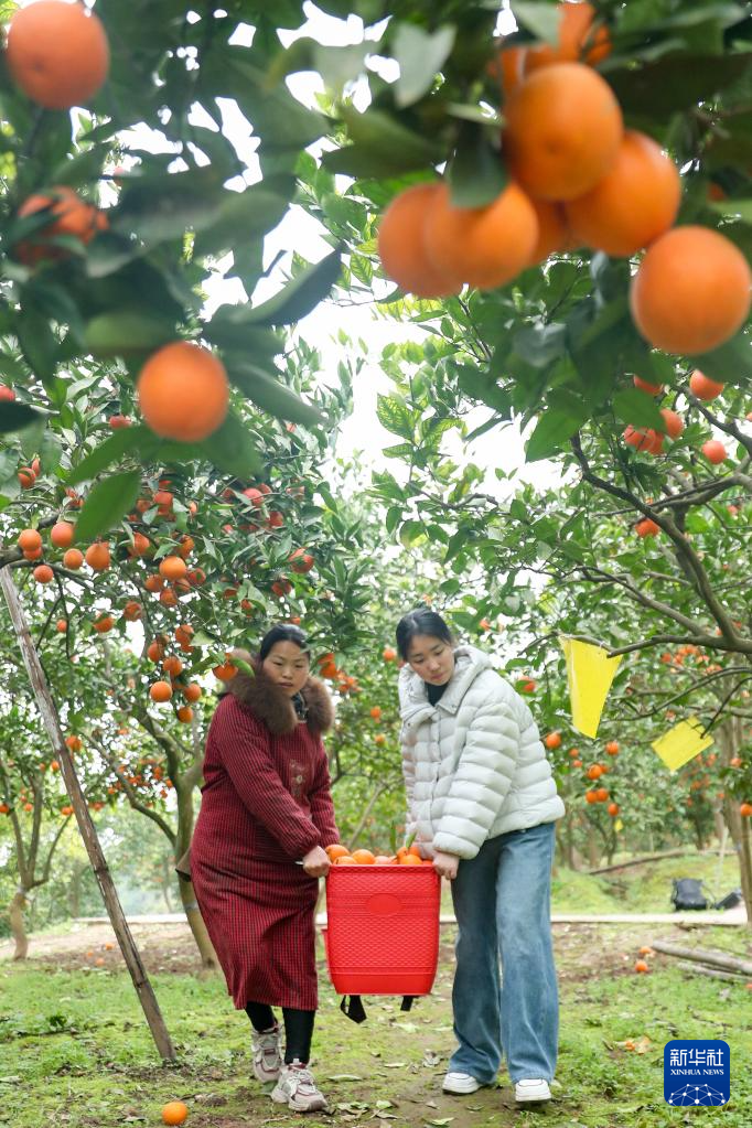 2月4日,四川省华蓥市永兴镇大佛山村村民抬运刚采摘的血橙。
