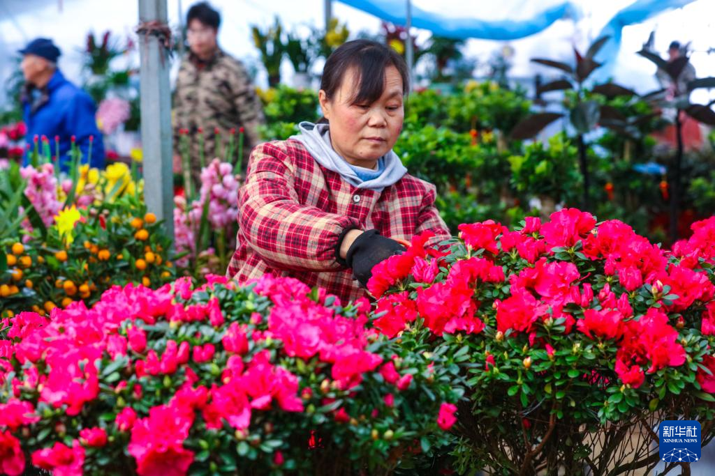 2月4日,在河南省信阳市光山县紫水街道三里桥社区一鲜花种植基地,花农在管理鲜花。