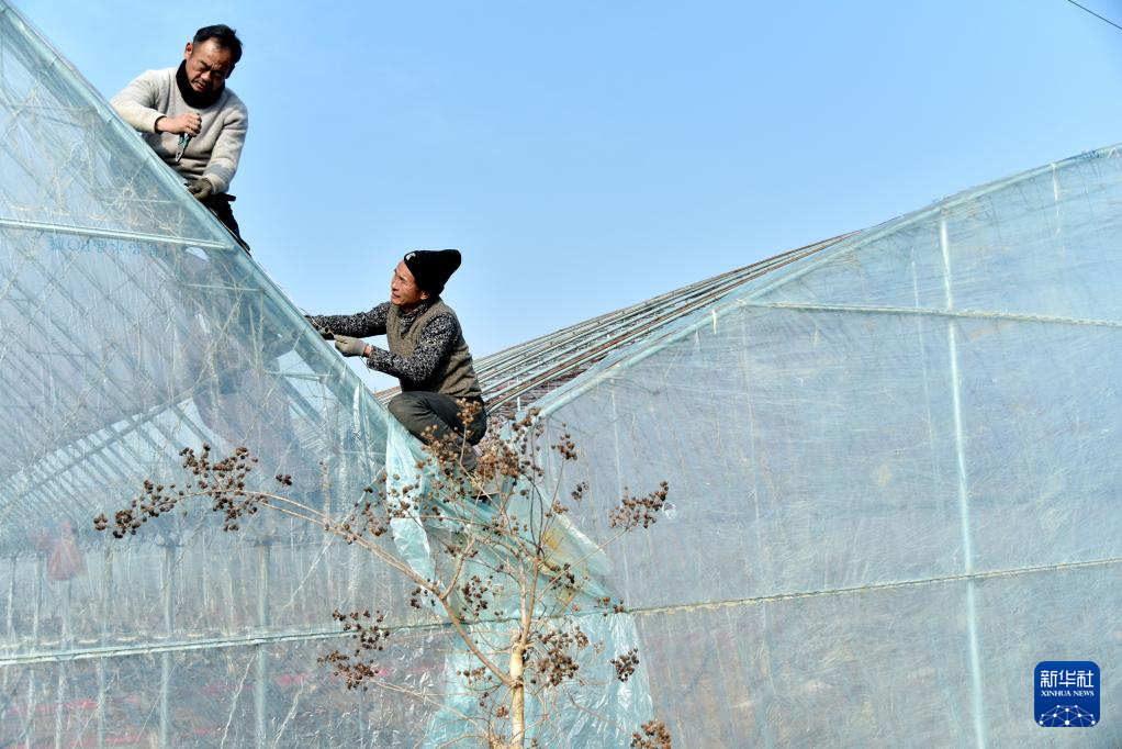 2月4日,在山东省枣庄市山亭区水泉镇,农民在建设樱桃大棚。