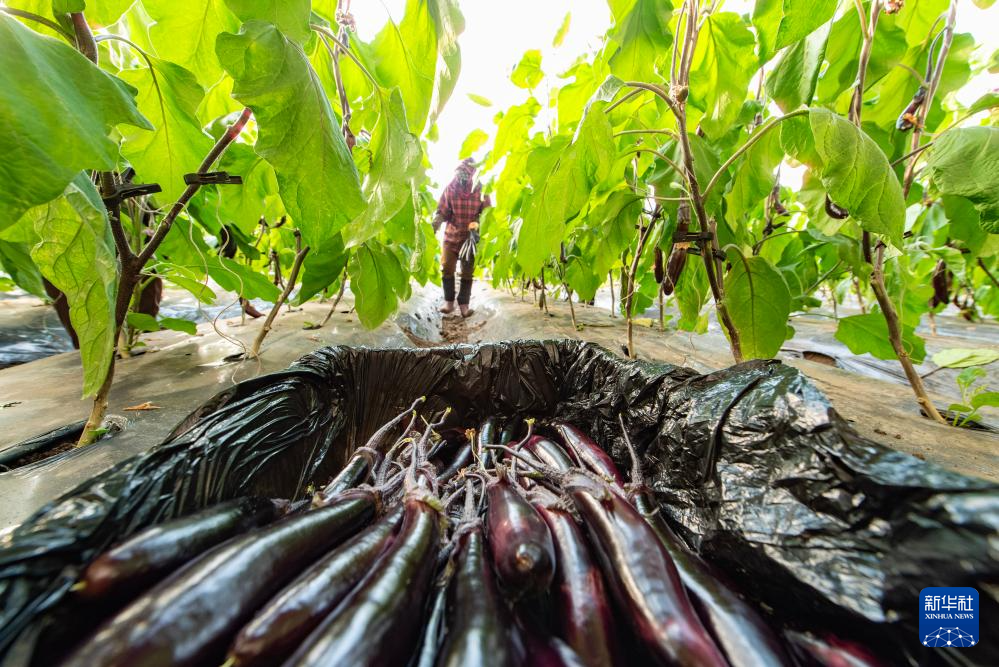 2月4日,黑龙江省富锦市一果蔬种植基地工人在大棚内采摘茄子。