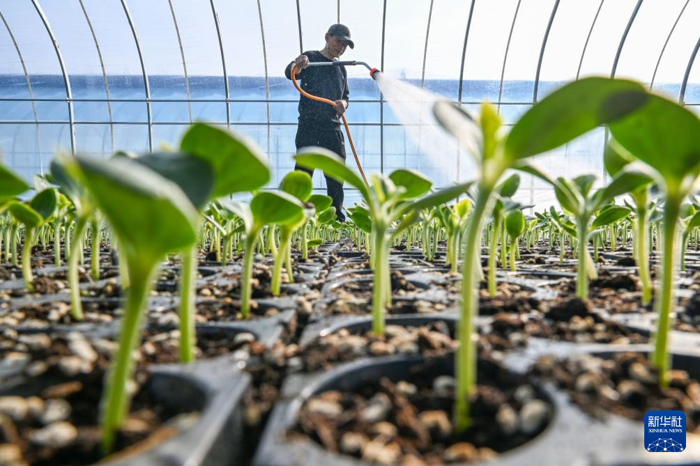 2月4日,在河南省商丘市夏邑县曹集街道一家瓜果育苗基地,村民给瓜苗浇水保墒。