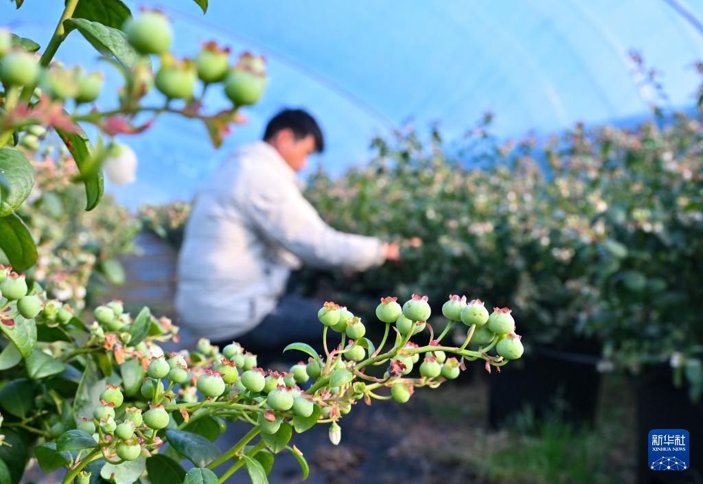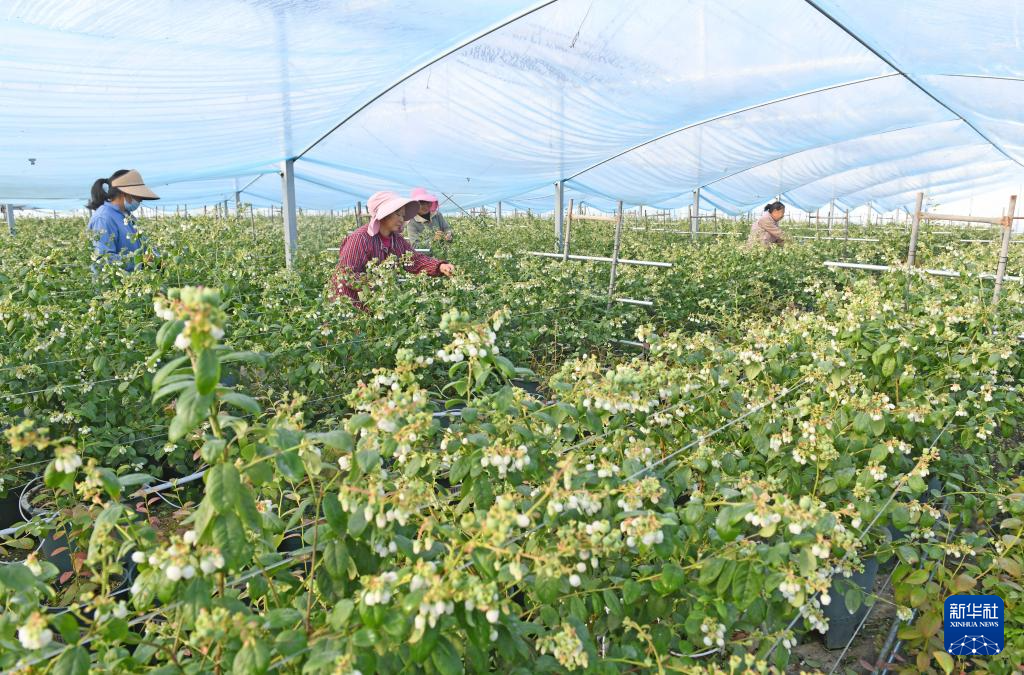 2月4日,在河南省商丘市夏邑县太平镇太平西村蓝莓园,农民为蓝莓疏花疏果。