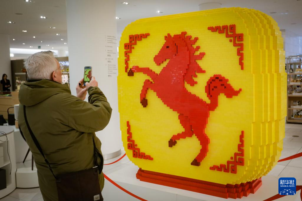 2月4日,在加拿大温哥华一家百货商店,顾客拍摄马年乐高积木装置。