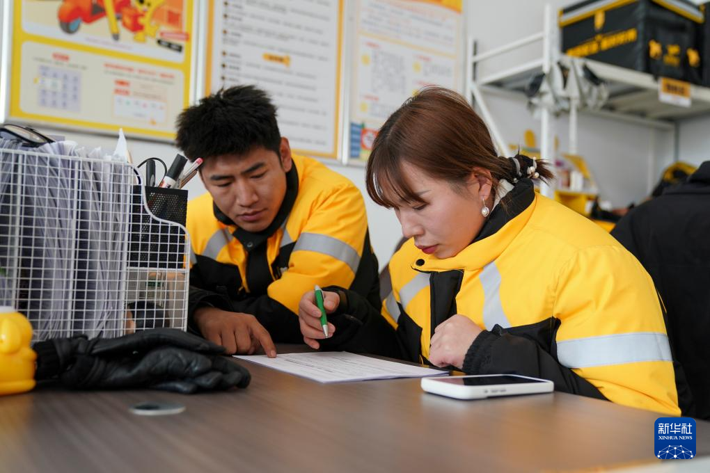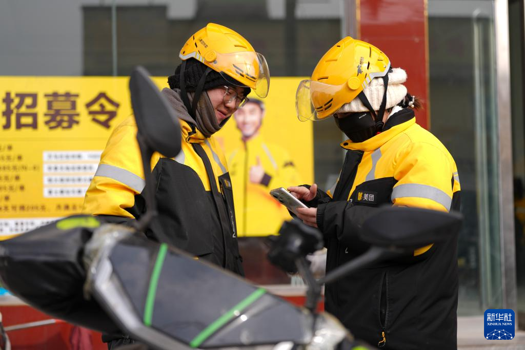 在位于山西省太原市小店区的美团配送合作商服务中心,戚德敏(右)确认上个月的出勤情况(2月4日摄)。