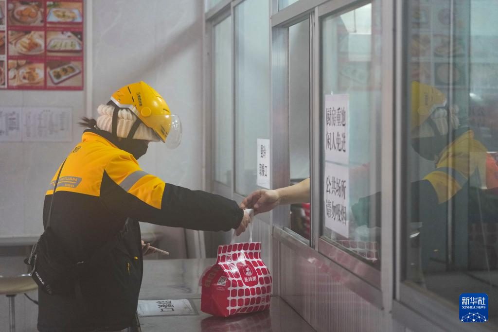 戚德敏在位于山西省太原市小店区的一家商户内取餐(1月29日摄)。