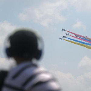 2月7日,在新加坡樟宜展览中心,观众观看中国空军八一飞行表演队的飞行表演。新华社发(朱姜海摄)pagebreak
