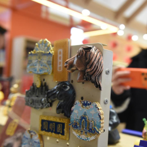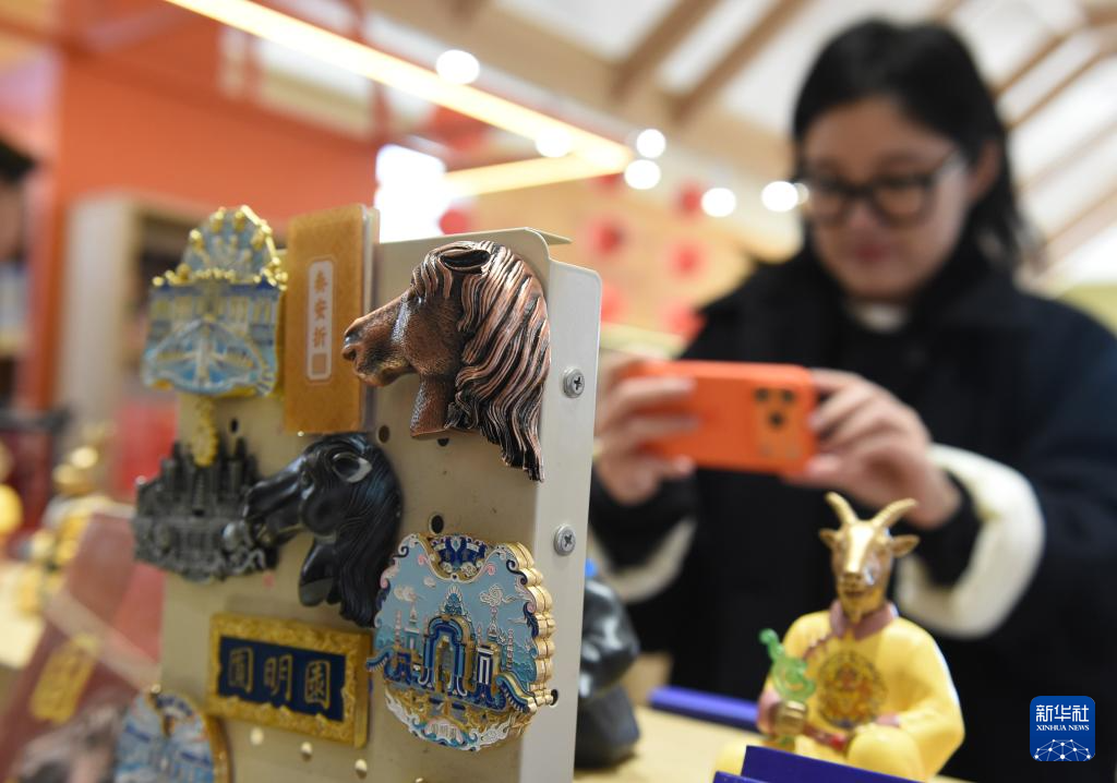 2月7日,游客在圆明园文创展示中心拍摄马年文创产品。