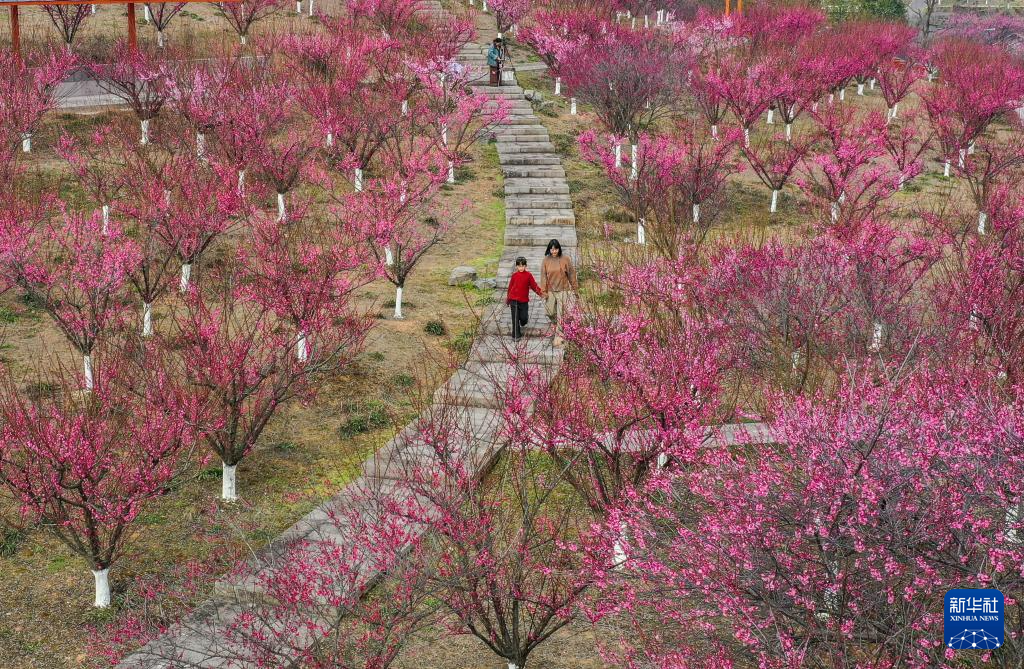 2月4日,游人在浙江省临海市古城梅园内赏梅游玩(无人机照片)。
