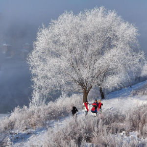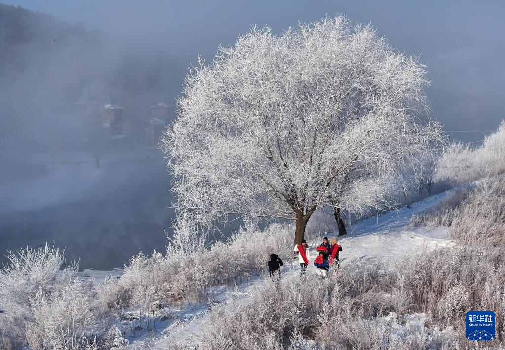 2月7日,游客在哈尔滨市西泉眼水库的雾凇美景中留影(无人机照片)。