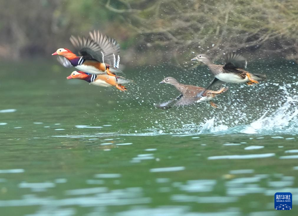 2月4日,鸳鸯在湖南省衡阳市衡东县杨林镇洣水河畔嬉戏。