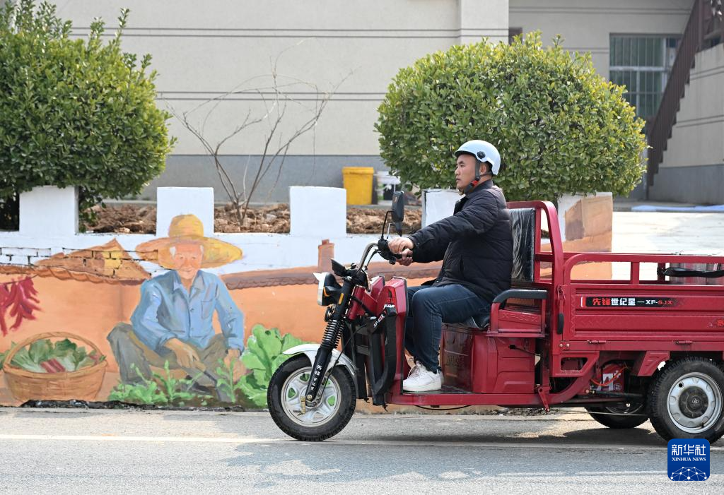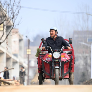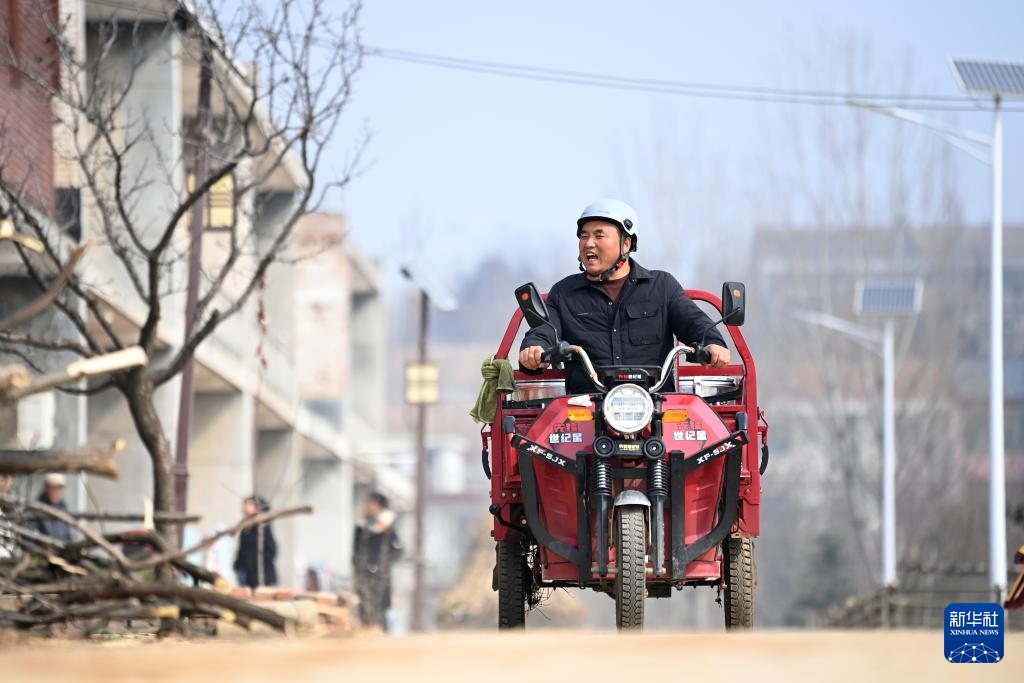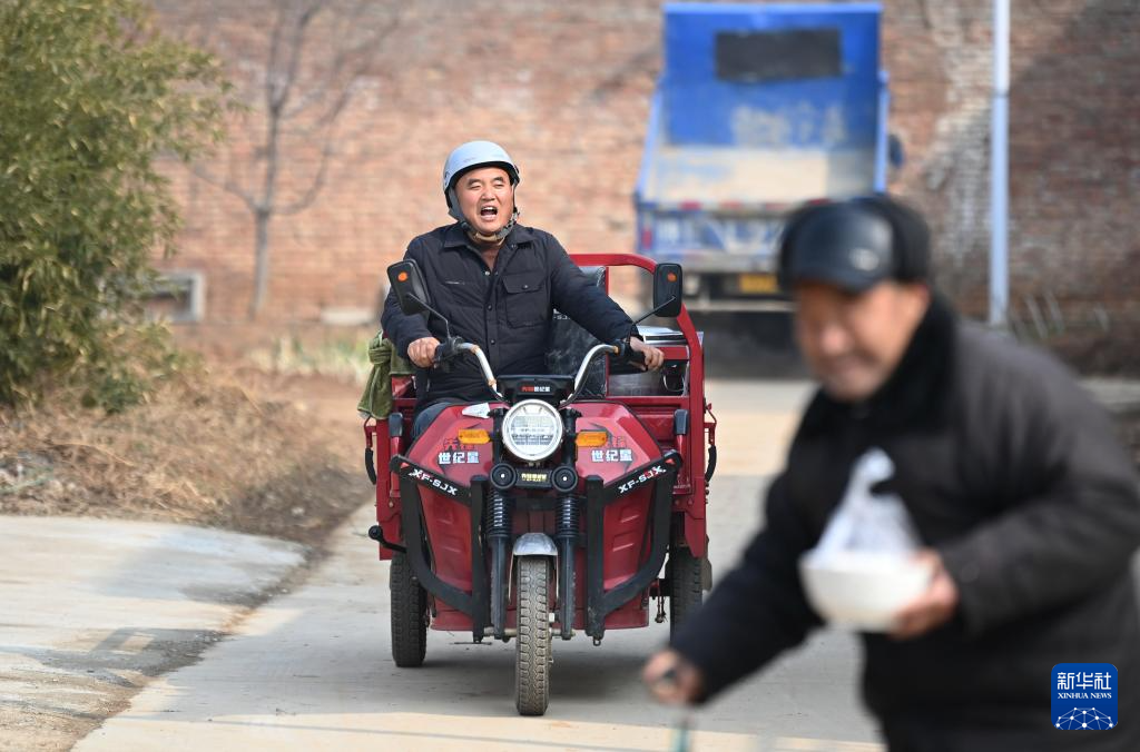 2月6日,庞富强骑着三轮车在里峪湾村为村中老人送午饭。