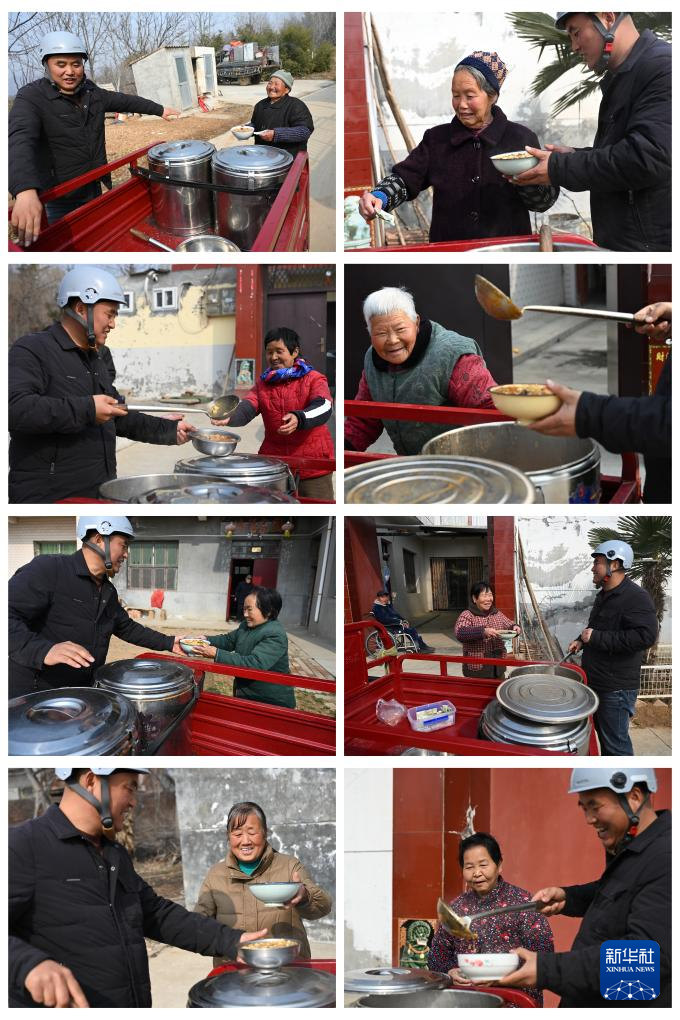 2月6日,庞富强为里峪湾村中的老人送午饭(拼版照片)。
