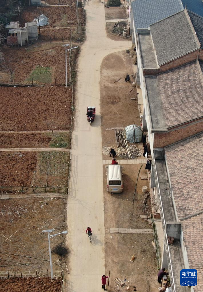 2月6日,庞富强骑着三轮车在里峪湾村为村中老人送午饭(无人机照片)。