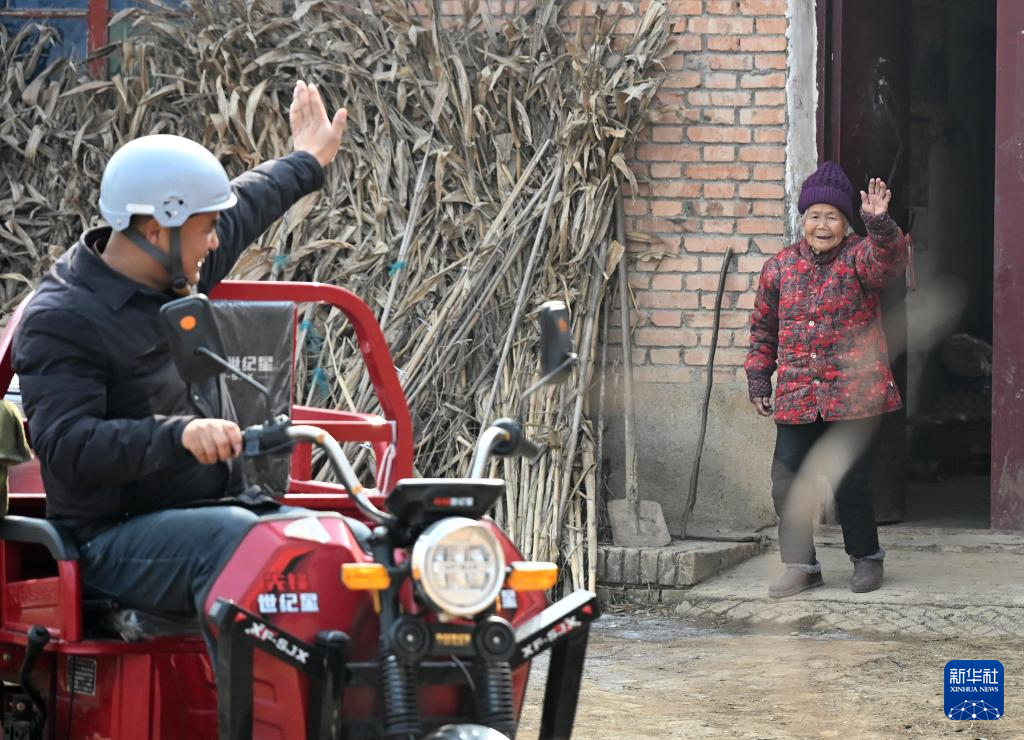 2月6日,一位盛好午饭的老人在家门口与庞富强挥手道别。