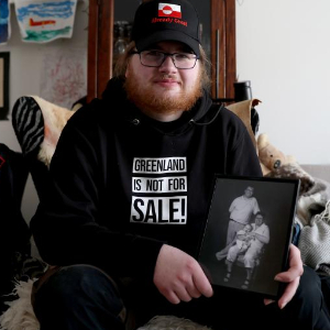 2月7日,在丹麦自治领地格陵兰岛首府努克,马利克·谢贝尔穿着“格陵兰岛不出售”的卫衣站在家门口。