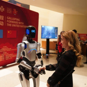 2月9日,在联合国总部举行的“骏启新程”新春庆祝活动上,一名嘉宾和机器人握手。