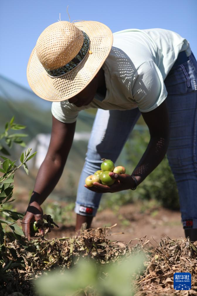 2月11日,在佛得角圣地亚哥岛圣多明戈斯市莫亚莫亚社区试验田,一名妇女采摘番茄。