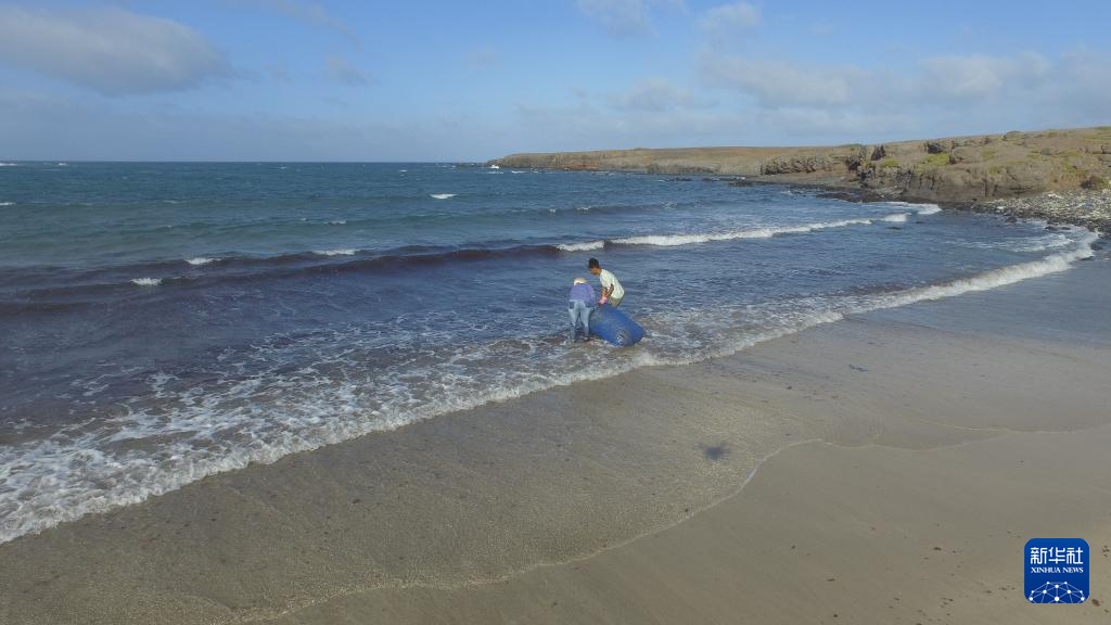 2月11日,在佛得角圣地亚哥岛圣多明戈斯市莫亚莫亚社区附近海滩,当地妇女将收集到的海藻装袋搬运(无人机照片)。