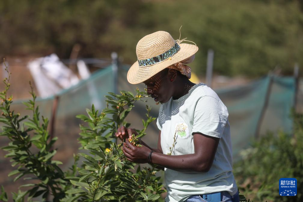 2月11日,在佛得角圣地亚哥岛圣多明戈斯市莫亚莫亚社区试验田,一名妇女在农田里检查作物枝叶。