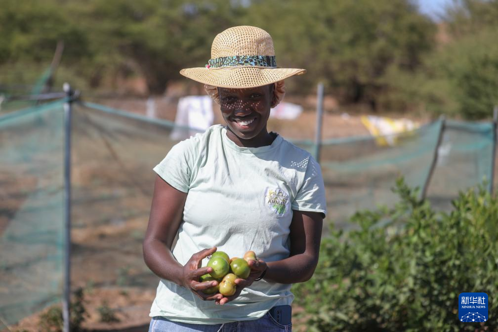 2月11日,在佛得角圣地亚哥岛圣多明戈斯市莫亚莫亚社区,一名妇女展示收获的番茄。