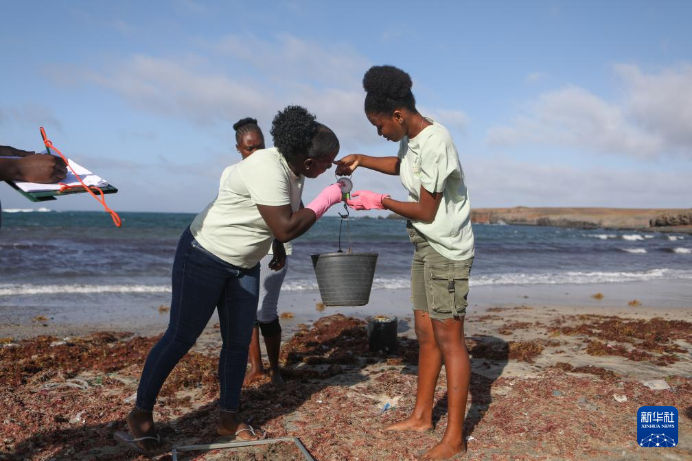 2月11日,在佛得角圣地亚哥岛圣多明戈斯市莫亚莫亚社区附近海滩,当地妇女对收集的海藻进行称重记录。