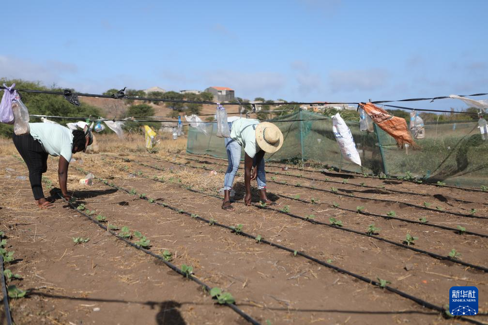 2月11日,在佛得角圣地亚哥岛圣多明戈斯市莫亚莫亚社区试验田,当地妇女在滴灌带旁管护作物幼苗。