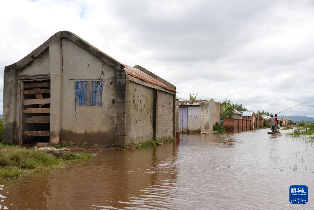 这是2月12日在马达加斯加首都塔那那利佛拍摄的被淹的房屋和道路。
