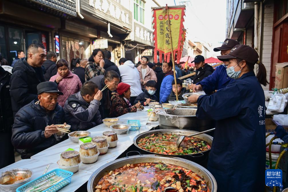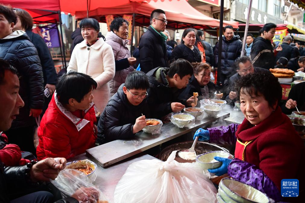 2月13日,游客在焦岱大集品尝特色小吃。