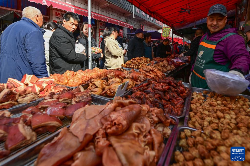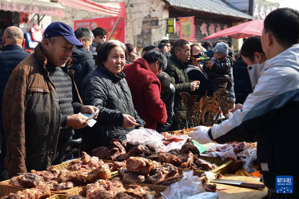 2月13日,游客在焦岱大集上选购特色食品。