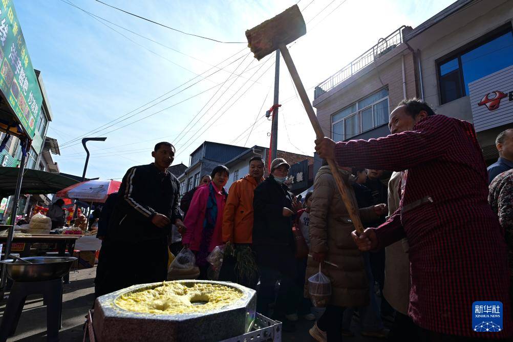 2月13日,游客在焦岱大集上观看糍粑制作。