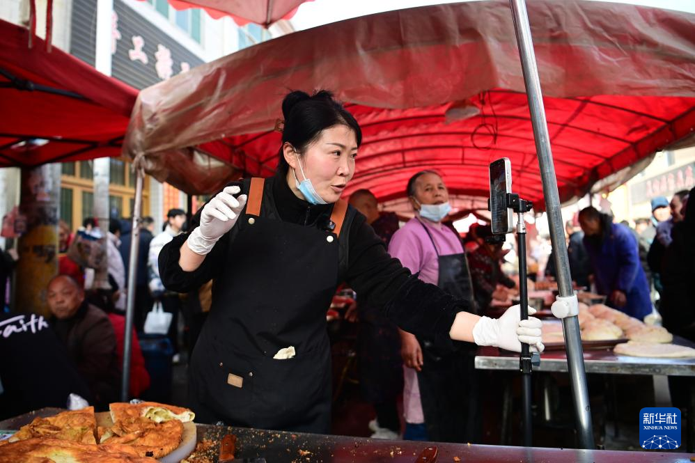 2月13日,一名摊主在焦岱大集上做直播。