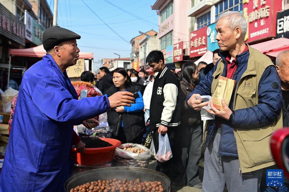 2月13日,一名摊主(左)在焦岱大集上与顾客交流。