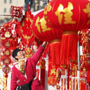 2月13日,市民在江苏南京一家小商品市场选购新春饰品。