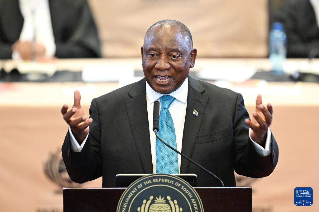 2月12日,在南非开普敦,南非总统拉马福萨在开普敦市政厅发表国情咨文讲话。