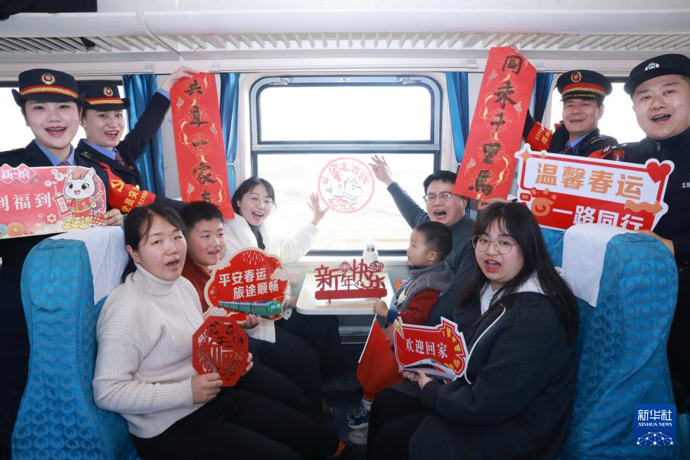 2月13日,在武昌开往安陆K5438次临客列车上,列车工作人员和旅客共迎新春。