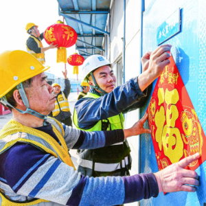 2月13日,在山东省胶州市上合示范区宋城演艺建设项目工地,中建八局四公司的工人们在生活区贴福字。